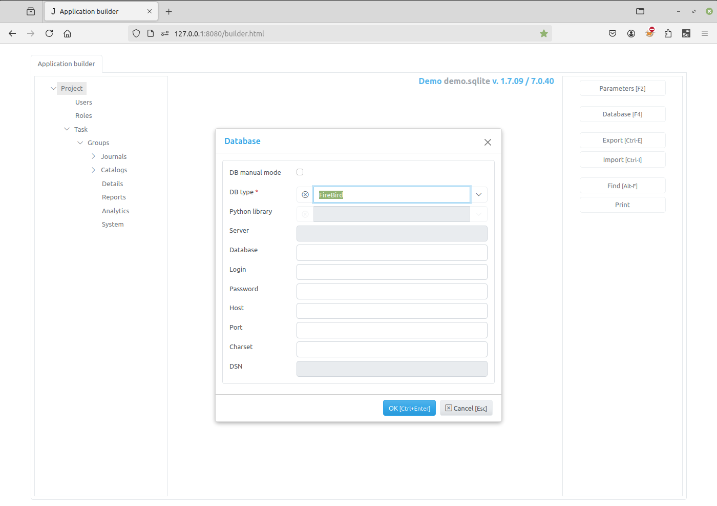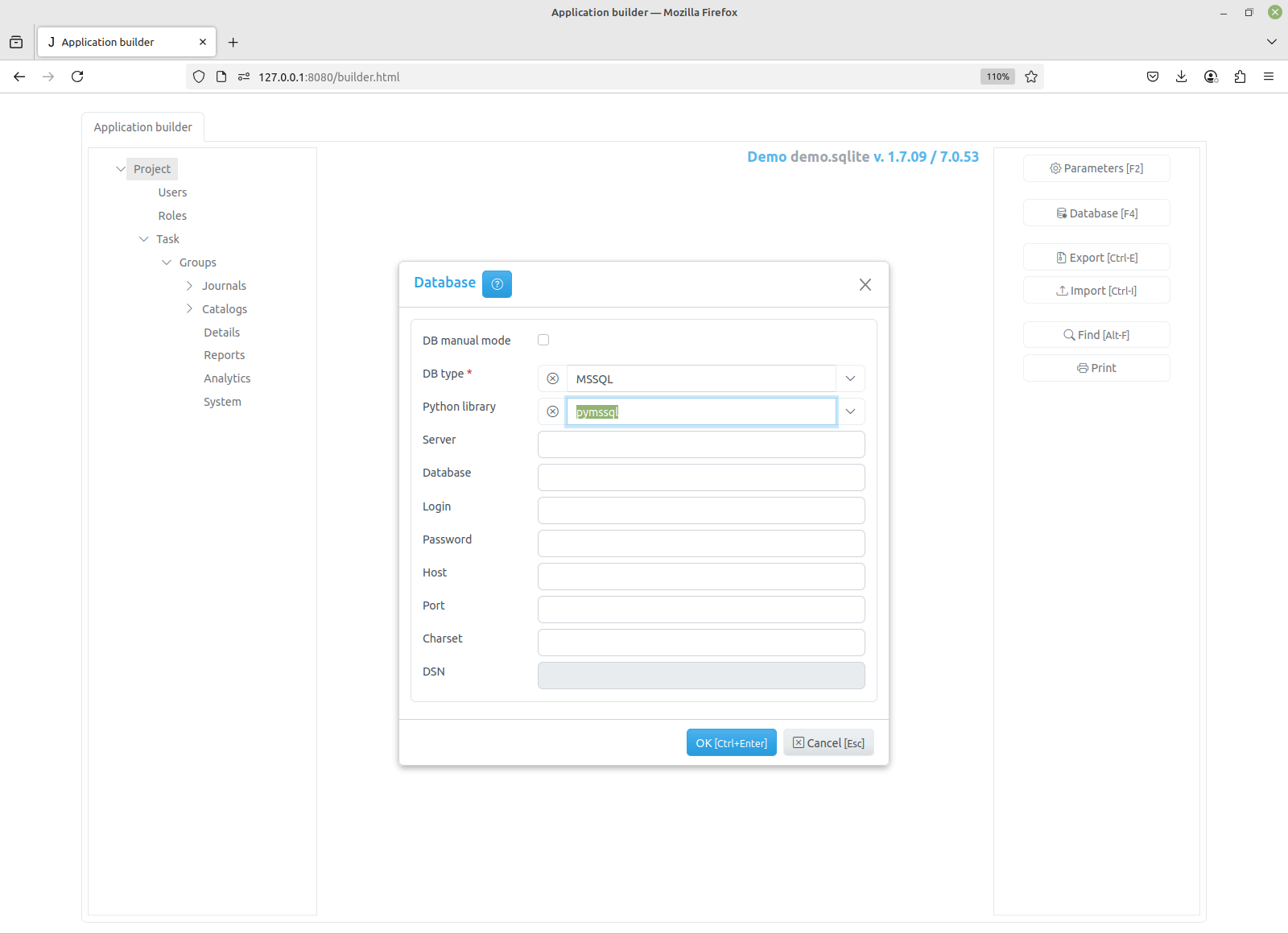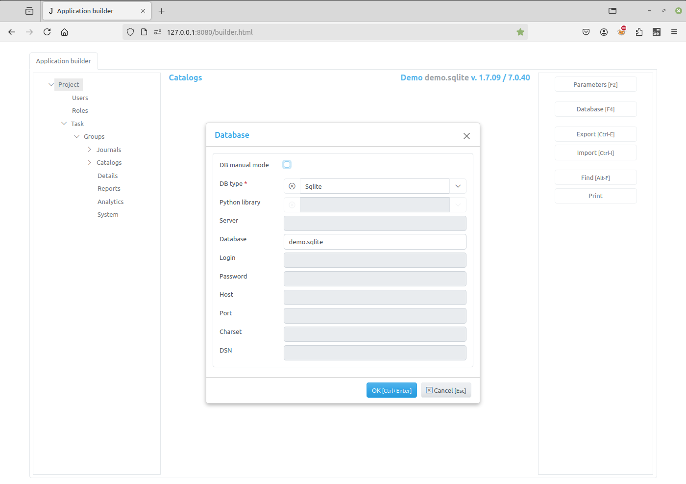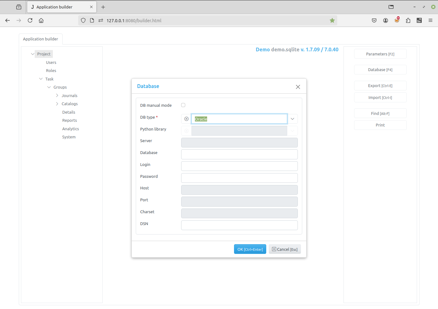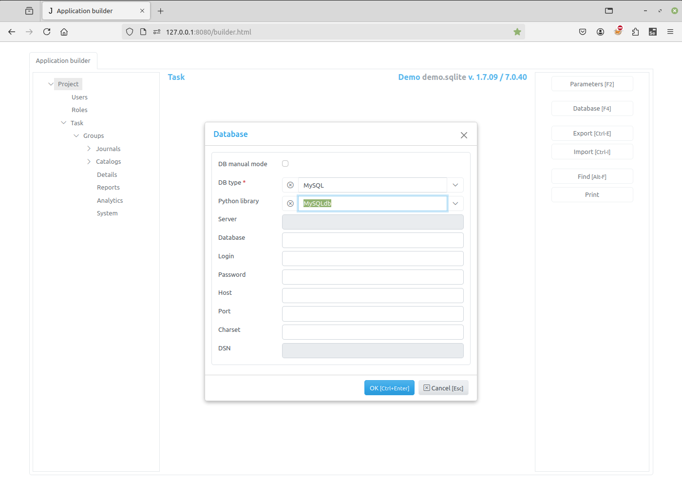 In this dialog project database parameters are displayed. When they have been changed and OK button is clicked, the Application builder will check connection to the database and if it failed to connect an error will be displayed.