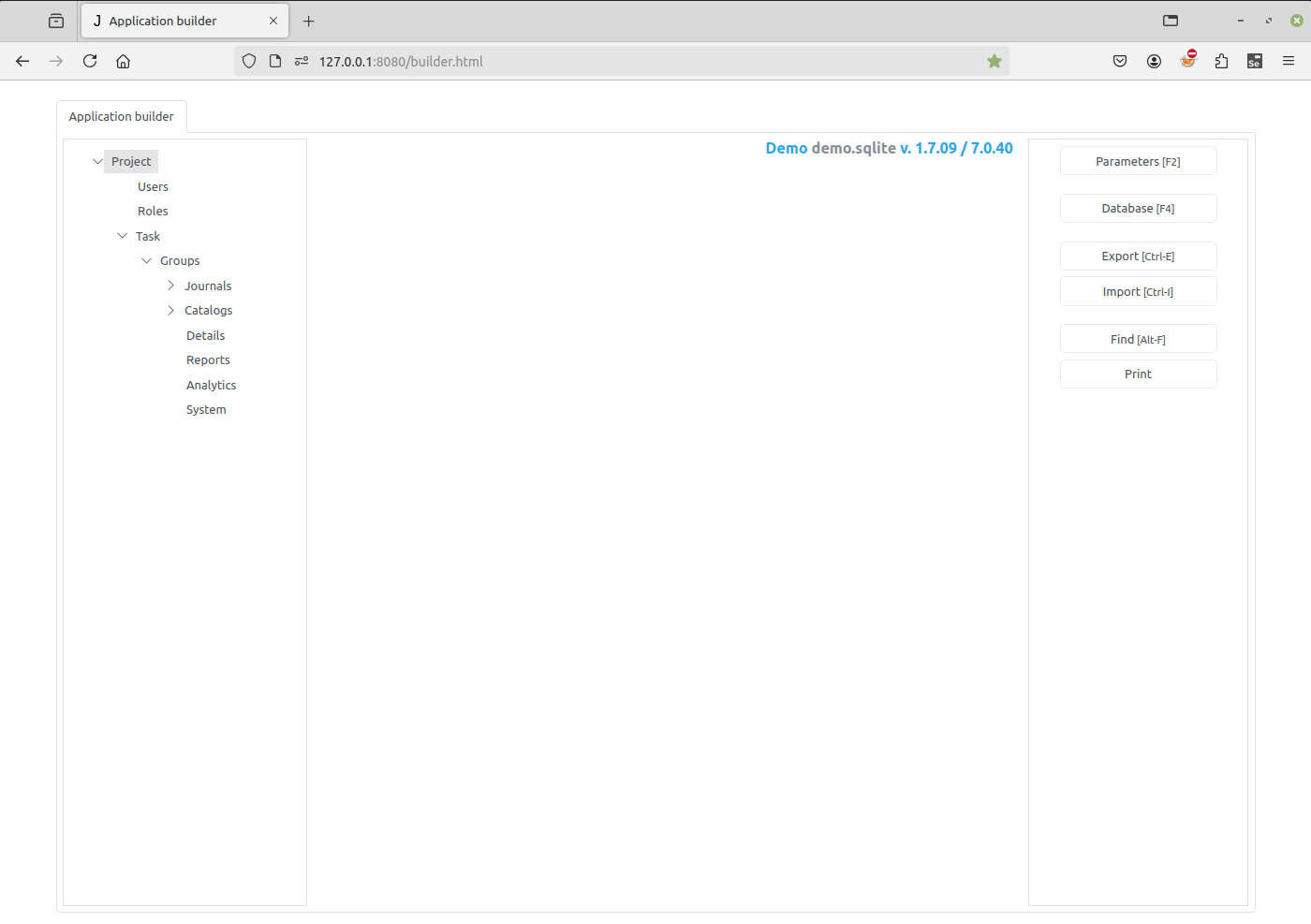 After the Application builder is first run or when the Project node is selected in the project tree, the Application builder page will look as follows: