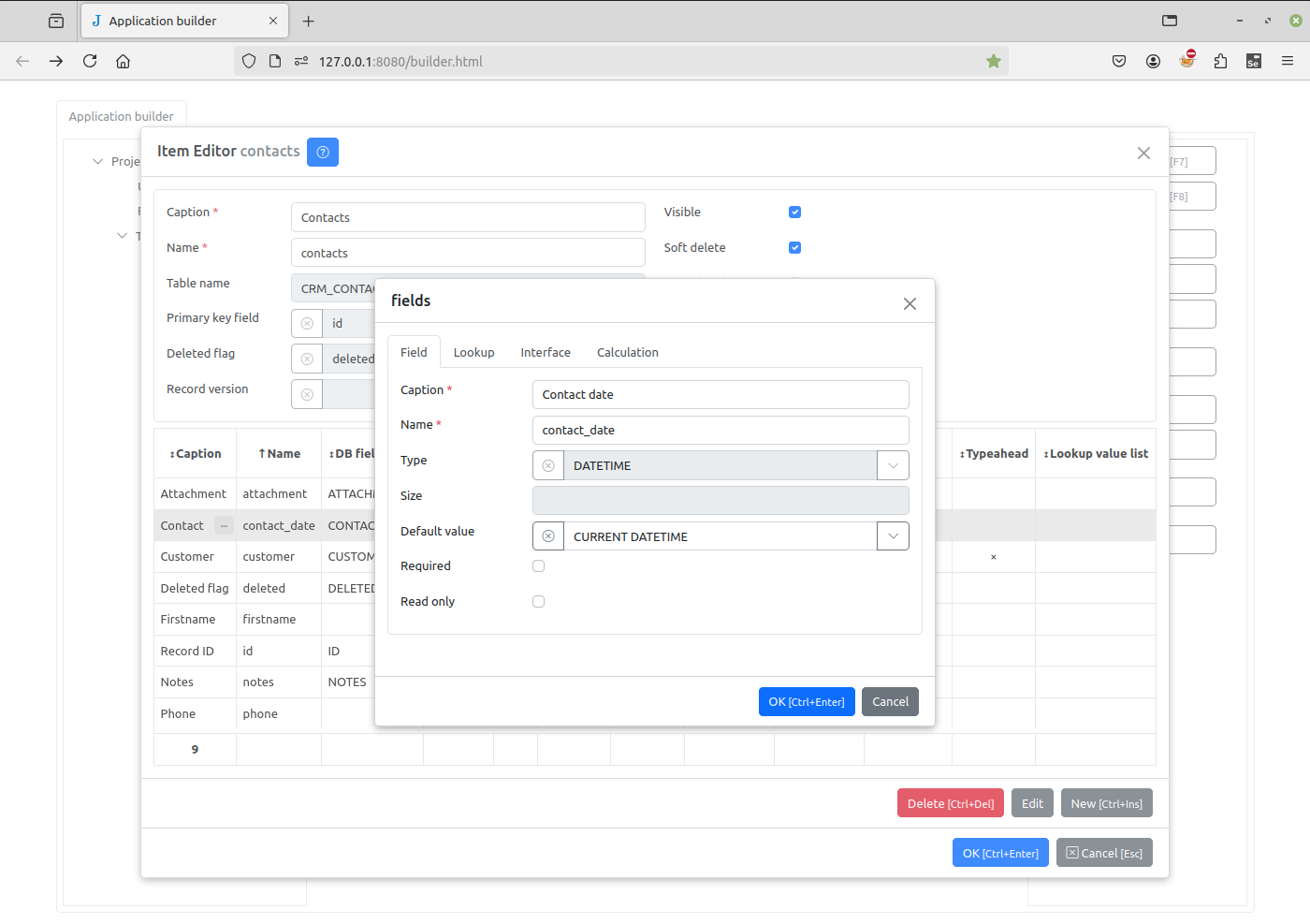 While we are here, set Default value of the “Contact date” field to “CURRENT DATETIME”, so that the date will be automatically initialised to the current date and time.