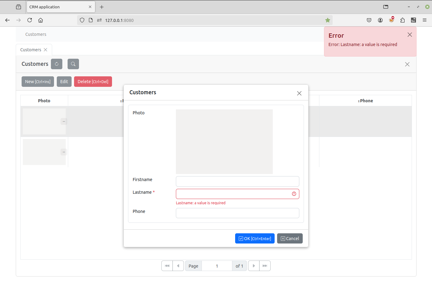 Then, click the New button to create a new customer. Fill in the dialog, then click the OK button: