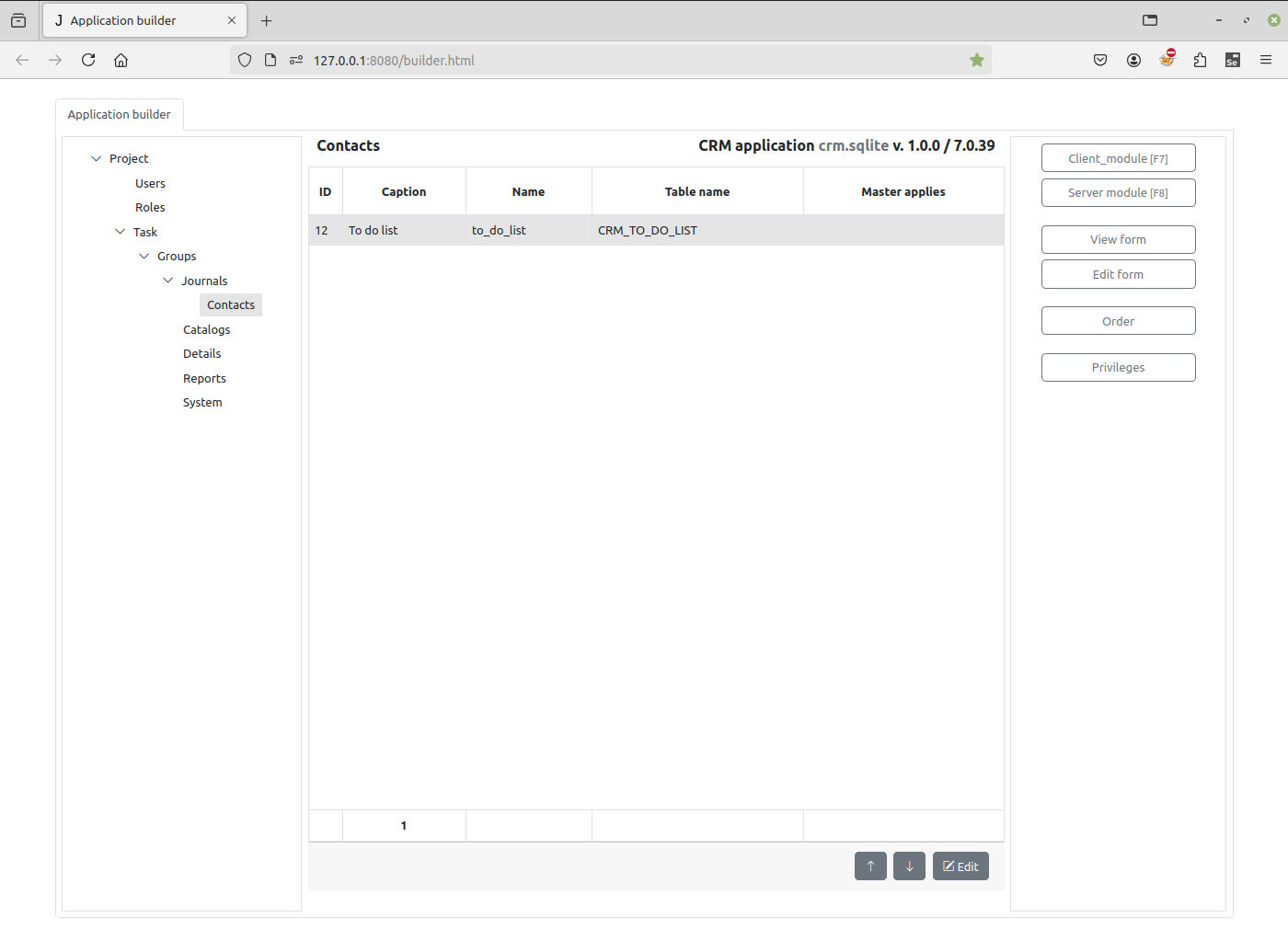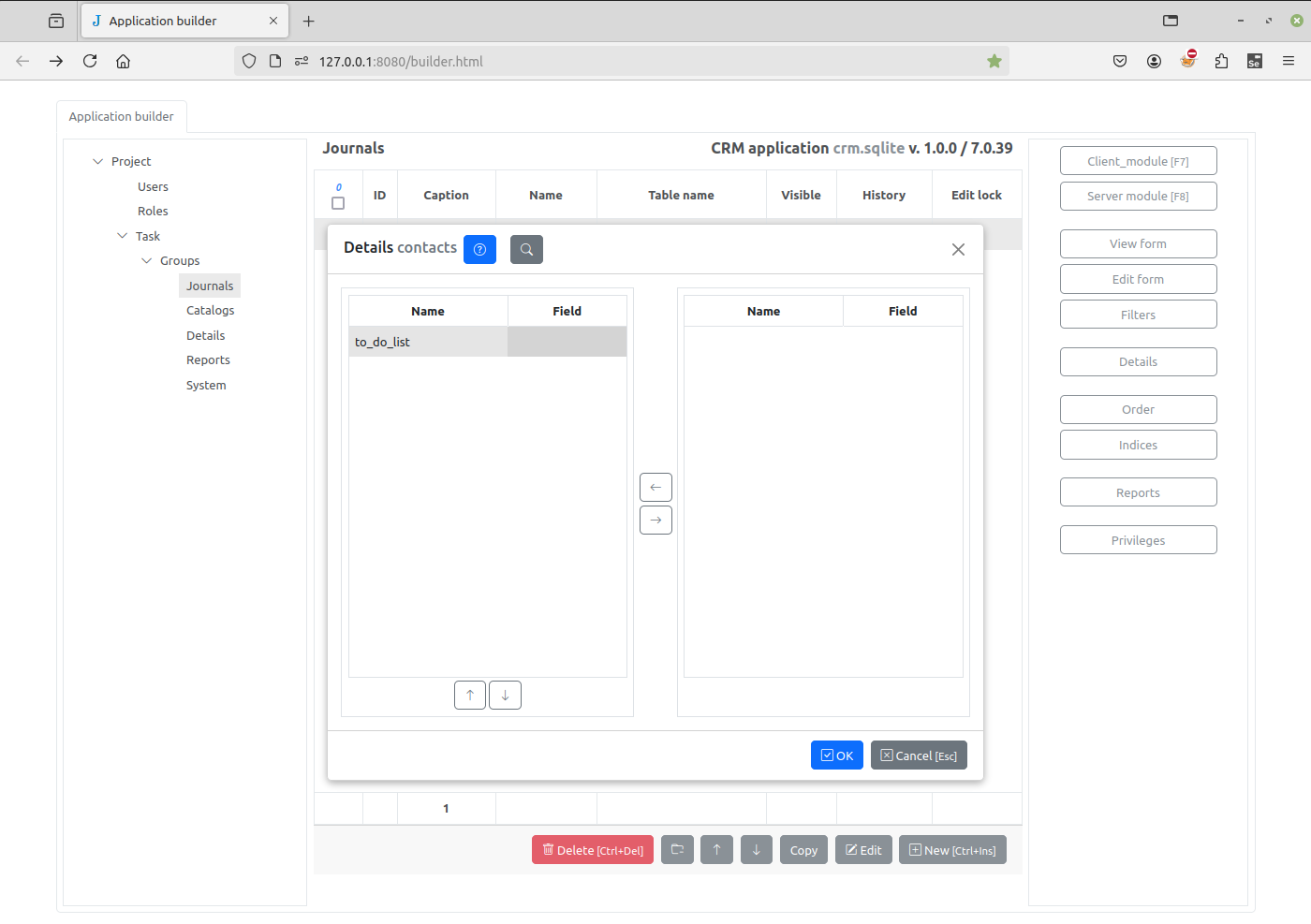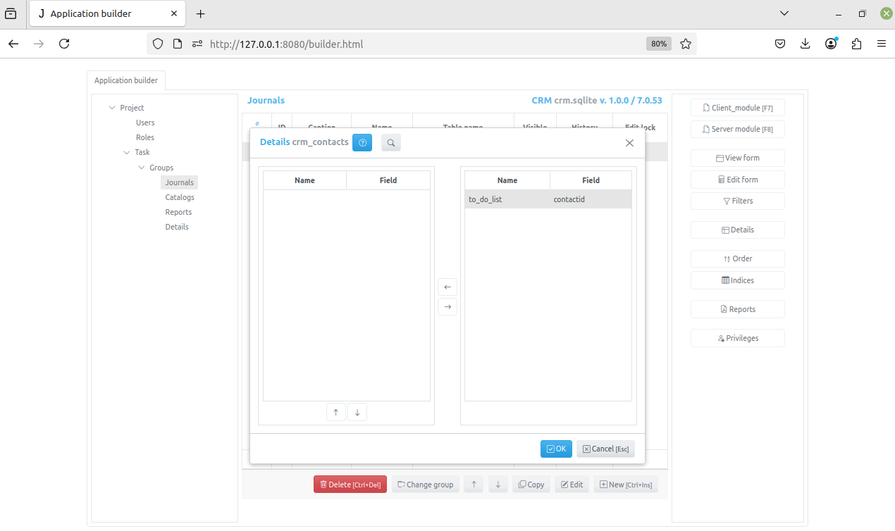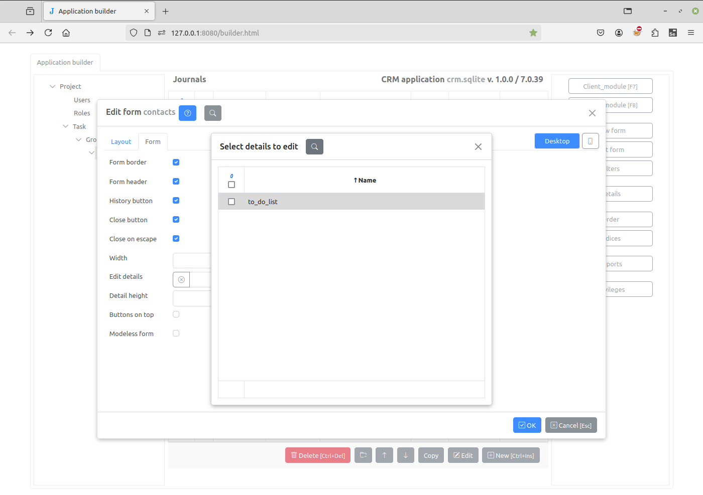 Select the “Contacts” journal again and click the Edit form button to open the Edit Form Dialog. Select Form tab, click the button to the right of the Edit details input and select the “To do list” check box.