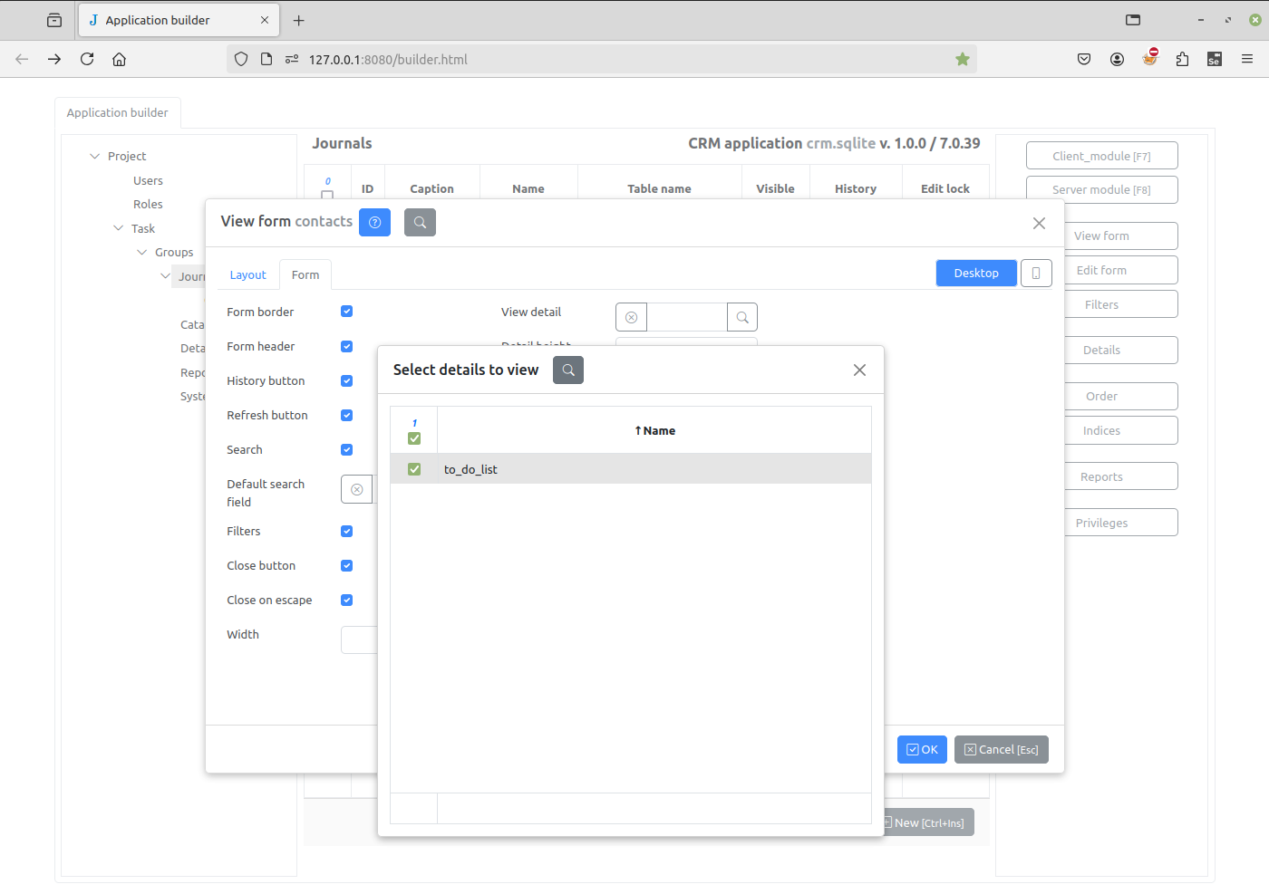 Select the “Contacts” journal again and click the View form button to open the View Form Dialog. Select Form tab, click the button to the right of the View detail input and select the “To do list” check box.